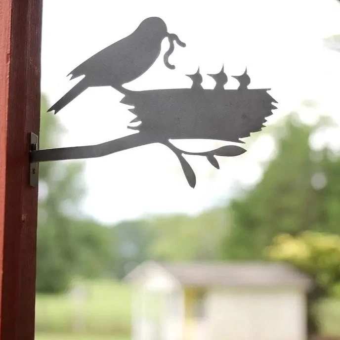 Handmade garden sculpture creates an eternal reminder of spring and the promise of rebirth with an attentive mom tending to nestlings.